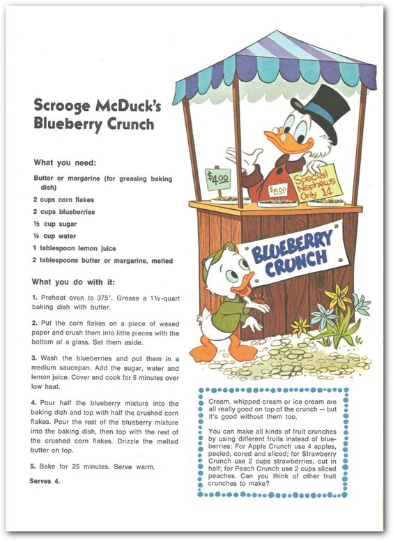 So you see why I love this recipe for Scrooge McDuck's Blueberry Crunch. Since this is a chocolate blog, you can substitute Kellogg's Chocolate Frosted Flakes for Corn Flakes and cut back on the sugar. I only use butter in the recipe (no margarine!). This is a great recipe for Summer. Enjoy!